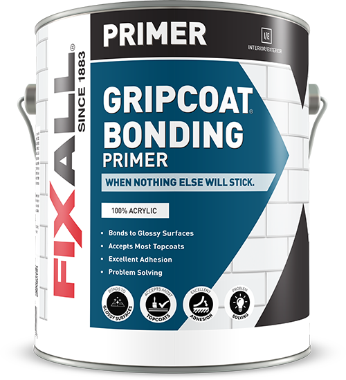 GripCoat Bonding Primer (previously Grabber Bonding Primer) is a water-based, urethane modified, acrylic primer-sealer with excellent adhesion to a wide variety of surfaces that usually present difficult adhesion problems. Although it is recommended that a test-patch be applied before proceeding, since there is such a wide variety of surfaces, PVC, other plastics, glass, fiberglass, glossy paints, tile or glazed block, galvanized metal, aluminum, copper, lead and tin can usually be successfully primed with this product. This product is suitable for interior or exterior exposures. It must be top-coated with latex, alkyd, urethane or waterborne epoxy topcoats.